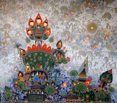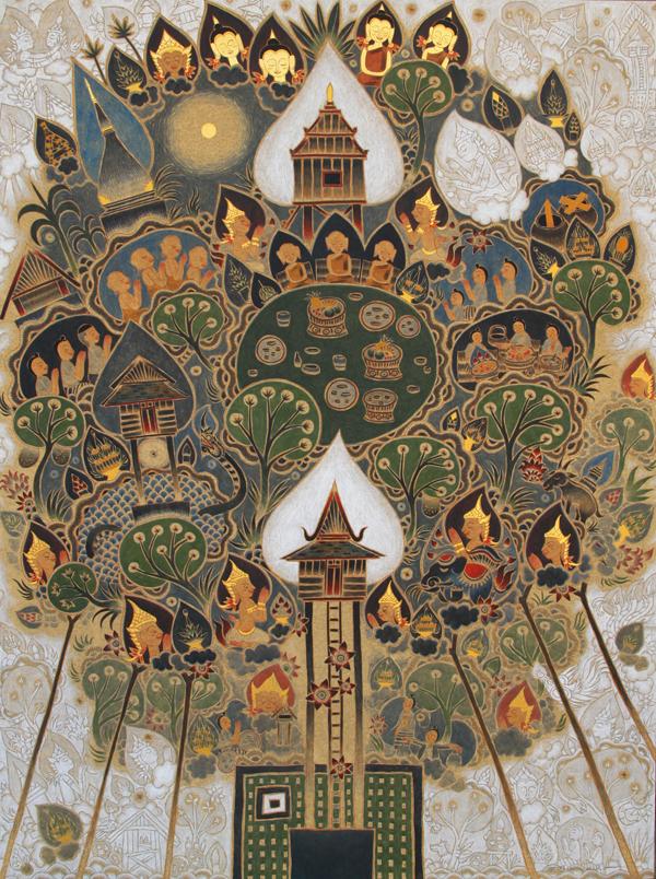 นิทรรศการครั้งนี้ข้าพเจ้าได้รับแรงบันดาลใจจากคําสอนในพุทธศาสนา อีกทั้ง คําบอกเล่า ต่างๆจากบรรพบุรุษจากรุ่นสู่รุ่น สืบเนื่องต่อกันมา ซึ่งสะท้อนคุณค่าและแนวทางในการสร้างสรรค์ ผลงานจิตรกรรมบน ศาสนสถาน เพื่อใช้แทนคําสอน ให้เข้าใจได้โดยง่าย ข้าพเจ้า มีความสนใจและประทับใจ ในวิถีชีวิตพื้นถิ่น อีสาน ที่ได้สัมผัส จึงได้นํามาถ่ายทอดและสร้างงานจิตรกรรม ที่แสดงความรู้สึกถึงความเป็นศิลปะพื้นถิ่น ตามลักษณะการแสดงออกส่วนตัวของข้าพเจ้า เพื่อให้เห็นถึงคุณค่าของจิตรกรรมที่เชื่อมโยงสัมพันธ์กับวัฒนธรรม ประเพณีท้องถิ่นไทยI got the inspiration from the teaching in Buddhism and from the stories that have been told from generation to generation. They are reflected the value and the way that local people use to create the painting on religious place. This painting helps people understand the teaching in Buddhism easier. I am interested and impressed in the way of life in Isan that I have known. So I would like to use my style to create the new painting but still keep the feeling of folk art . Because I would like to show the value of the painting that connects with culture and local Thai tradition.